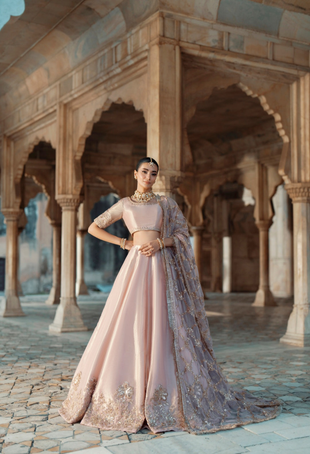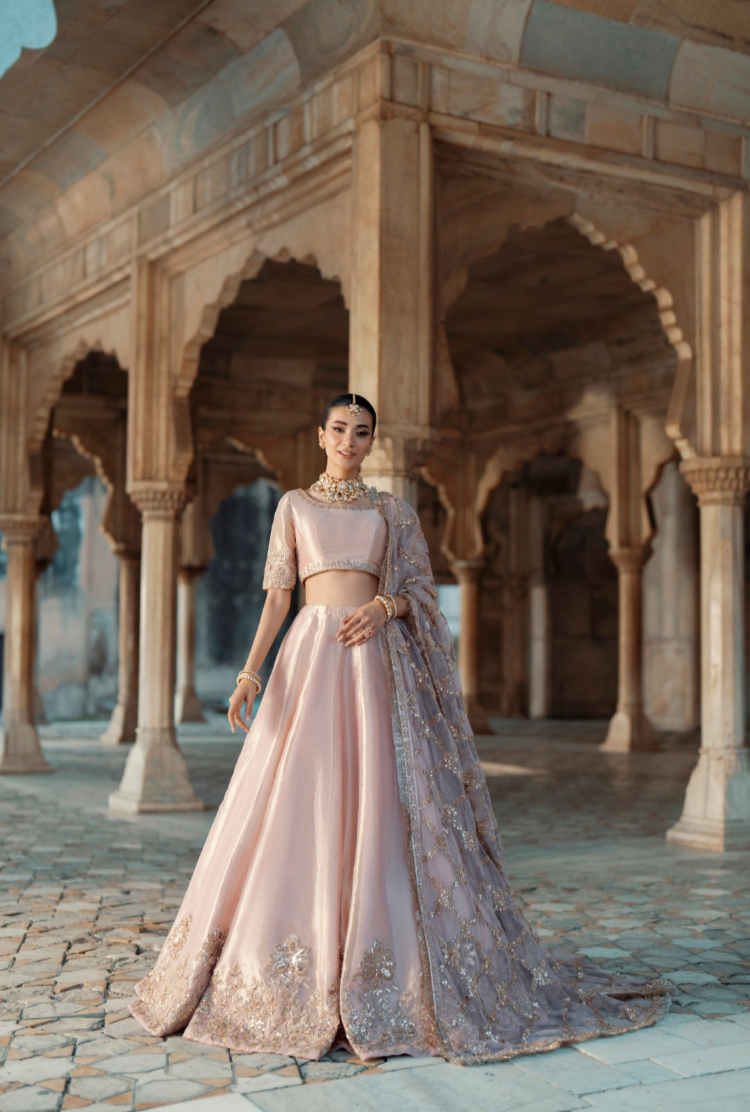 Our rose gold tissue lehenga and choli set is crafted with intricate embroidery on both the choli and lehenga, paired with a heavily embellished net dupatta. The perfect pick for daytime events — or shine like a goddess in the golden hour. 🌸