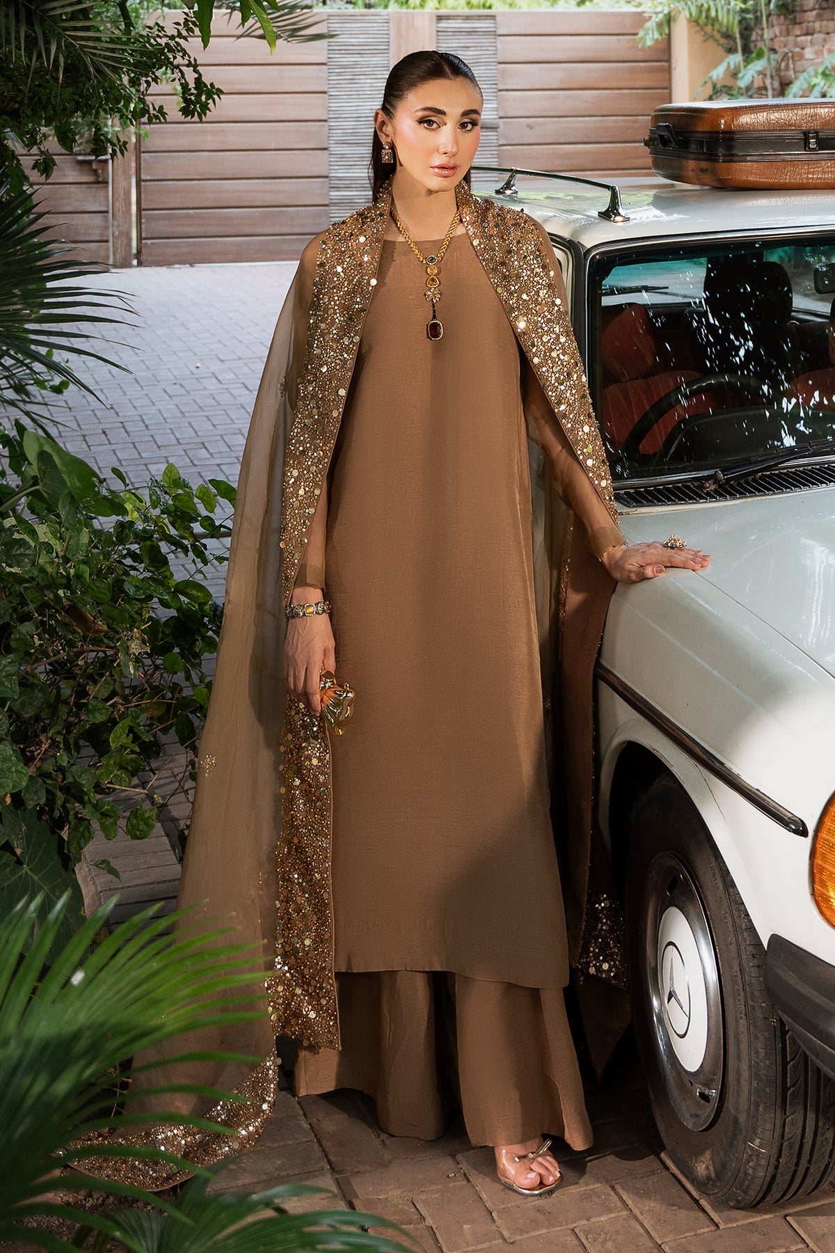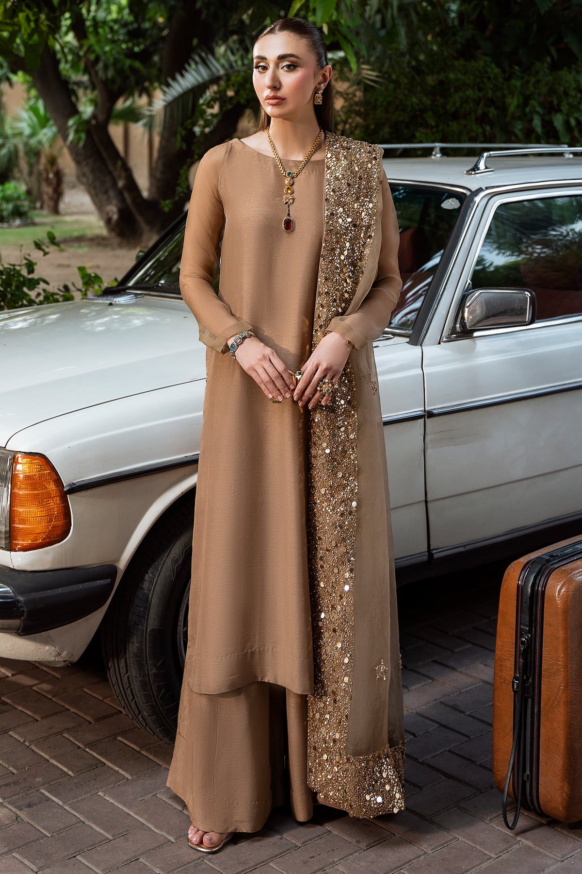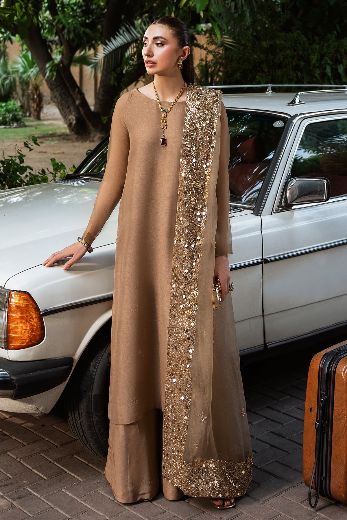 An elegant celebration of versatility, Mehrab is an ensemble that shines across occasions. Crafted from premium Korean raw silk, the rich, Pantone-perfect hue is timeless — glowing softly in daylight, and shimmering like a starlit sky by night. A light organza dupatta, edged with sitara and pearl detailing, completes the look with a soft sparkle — the perfect accent to an outfit that blends simplicity with quiet luxury.