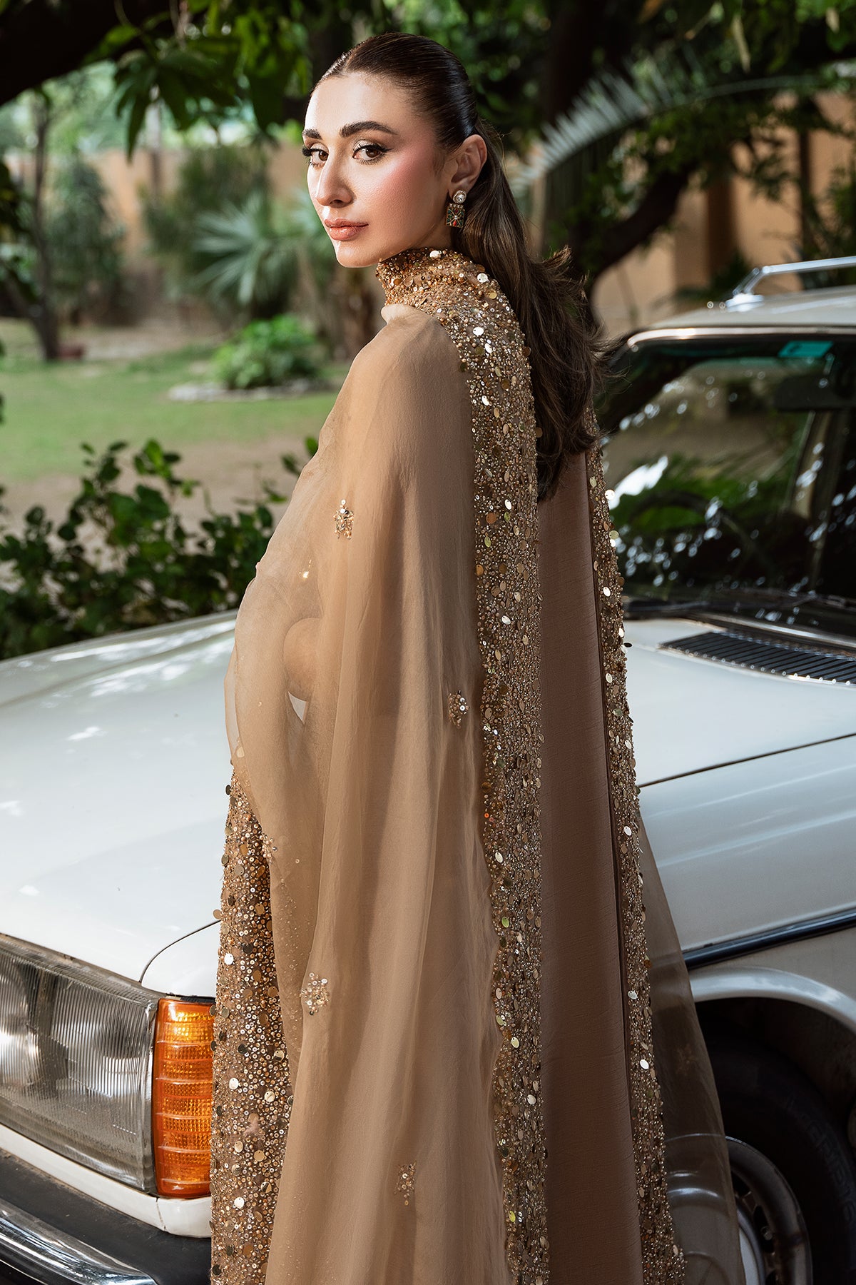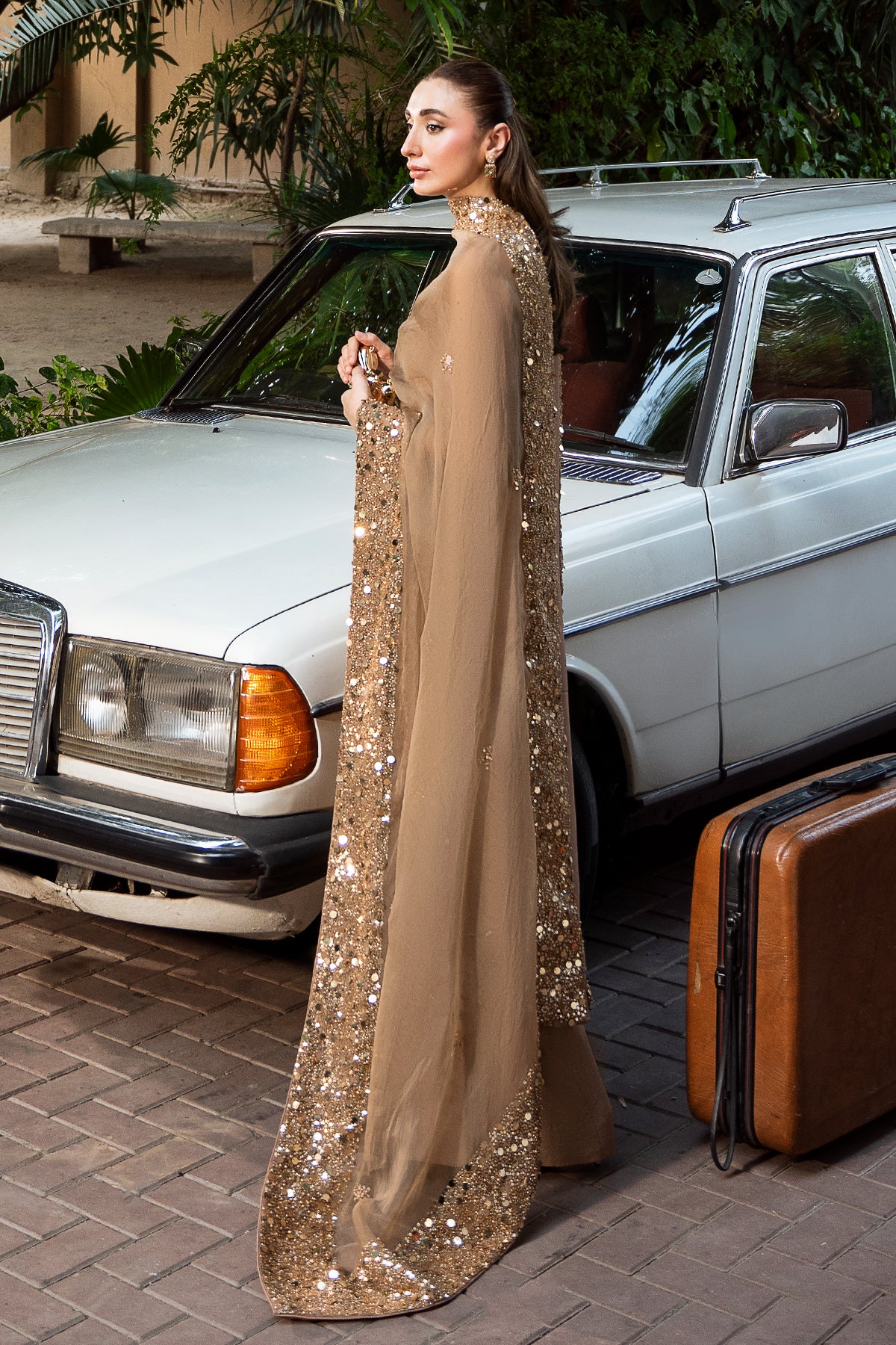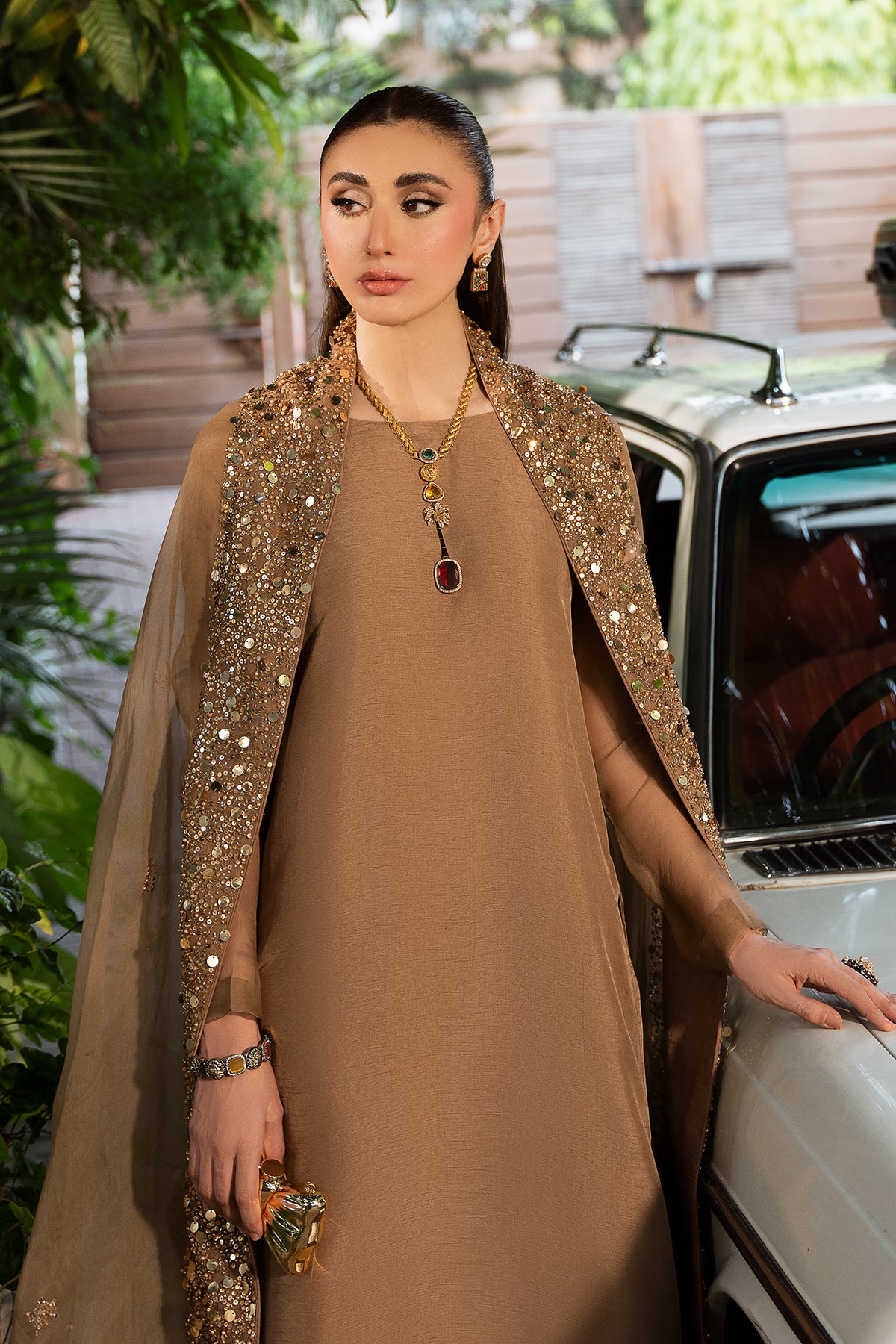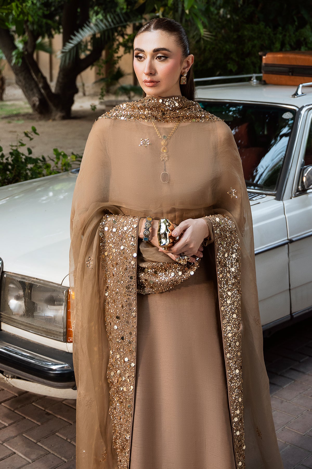 An elegant celebration of versatility, Mehrab is an ensemble that shines across occasions. Crafted from premium Korean raw silk, the rich, Pantone-perfect hue is timeless — glowing softly in daylight, and shimmering like a starlit sky by night. A light organza dupatta, edged with sitara and pearl detailing, completes the look with a soft sparkle — the perfect accent to an outfit that blends simplicity with quiet luxury.