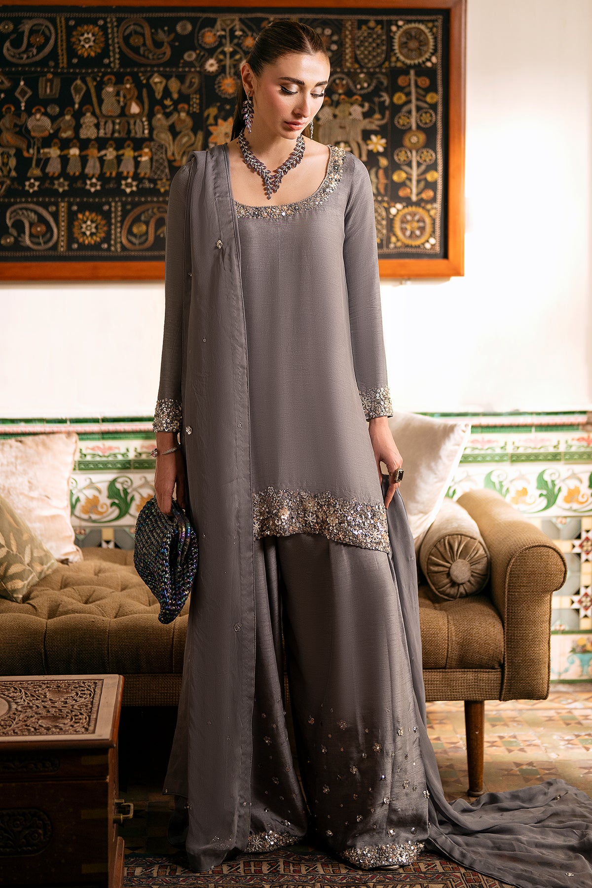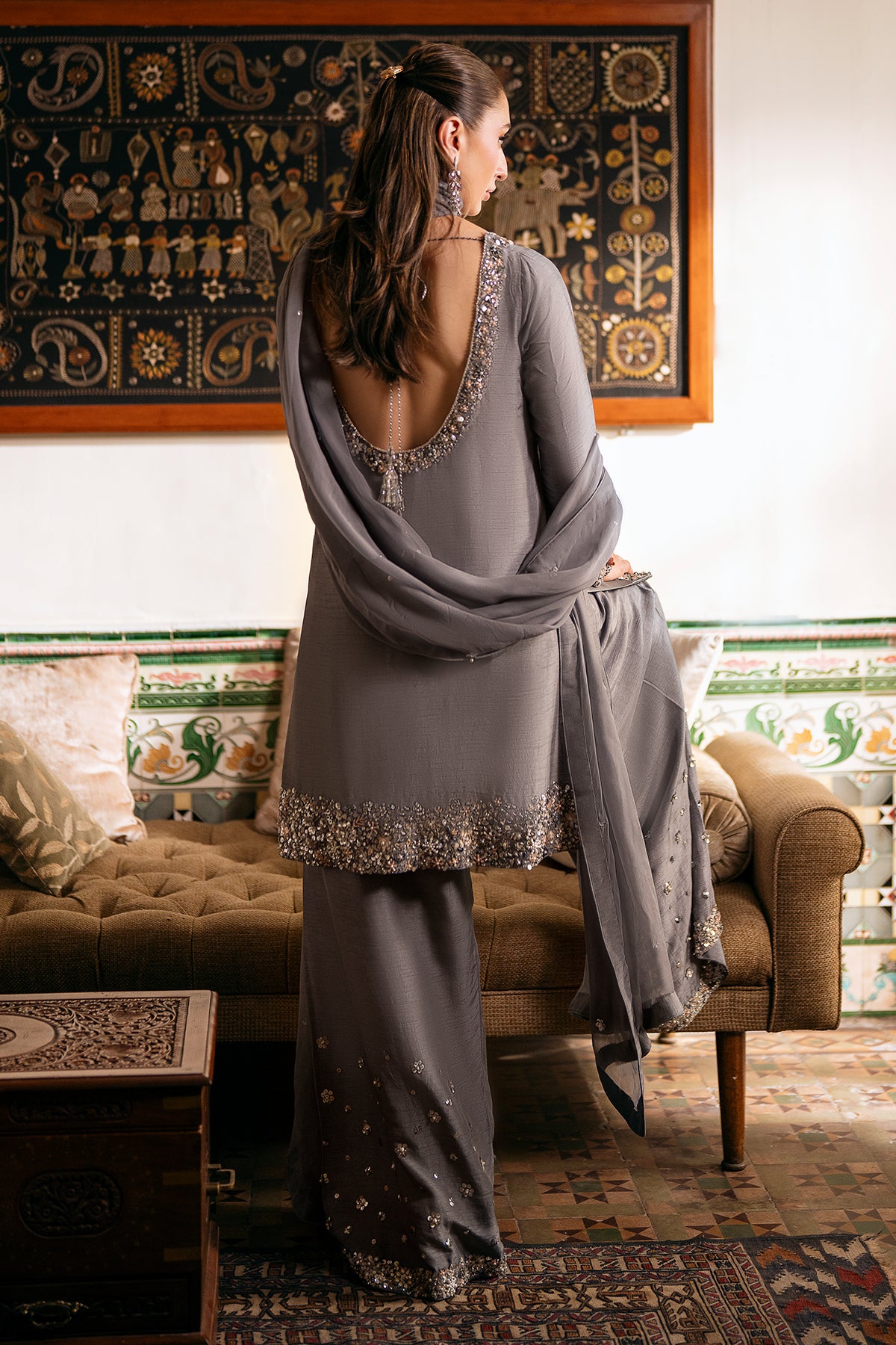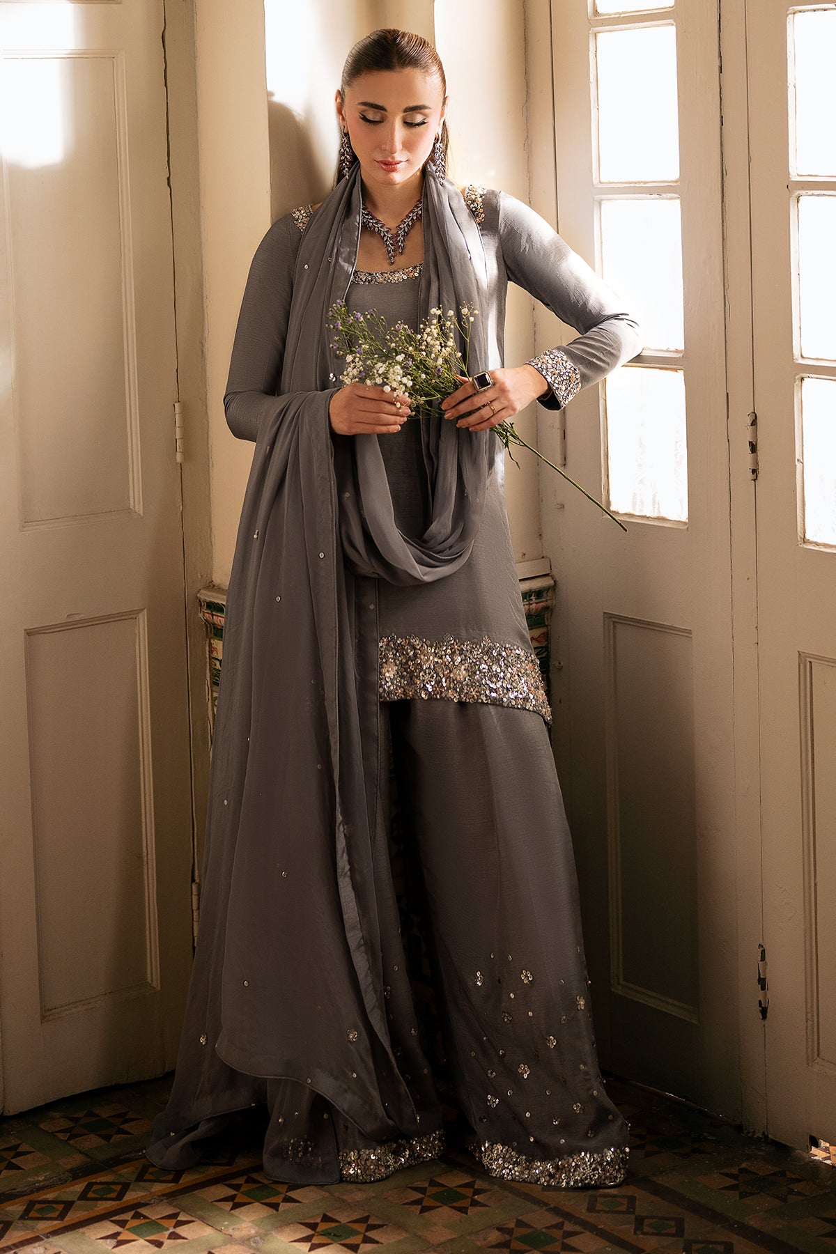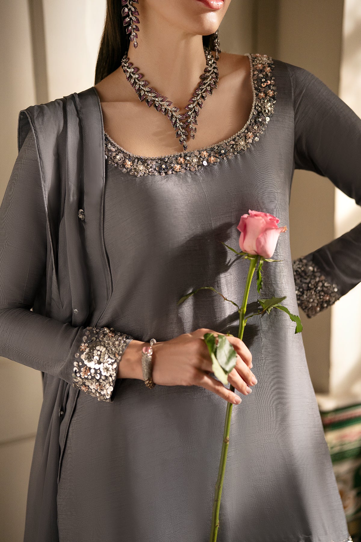 An ode to quiet glamour, this surmai grey short shirt in Korean raw silk is adorned with 3D floral embroidery, hand-finished with sequins, sitarey, pearls, nalki, and soft tassels of crystal and resham doori — every detail whispering understated luxury.