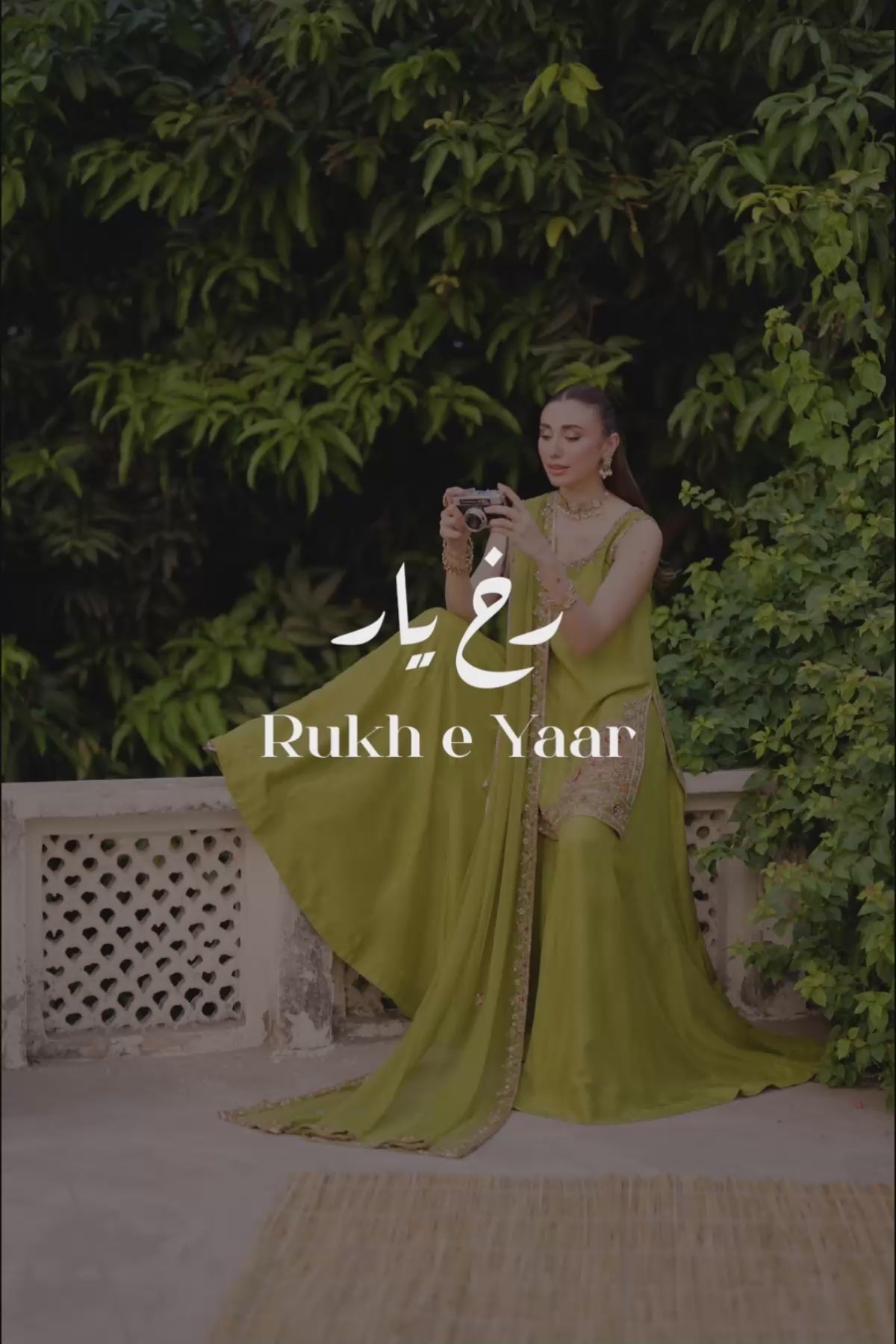 Paired with a wide-leg sharara, the silhouette flows with ease, while a chiffon dupatta, framed with a four-sided embellished border and scattered multicolour motifs, adds a light, graceful finish.