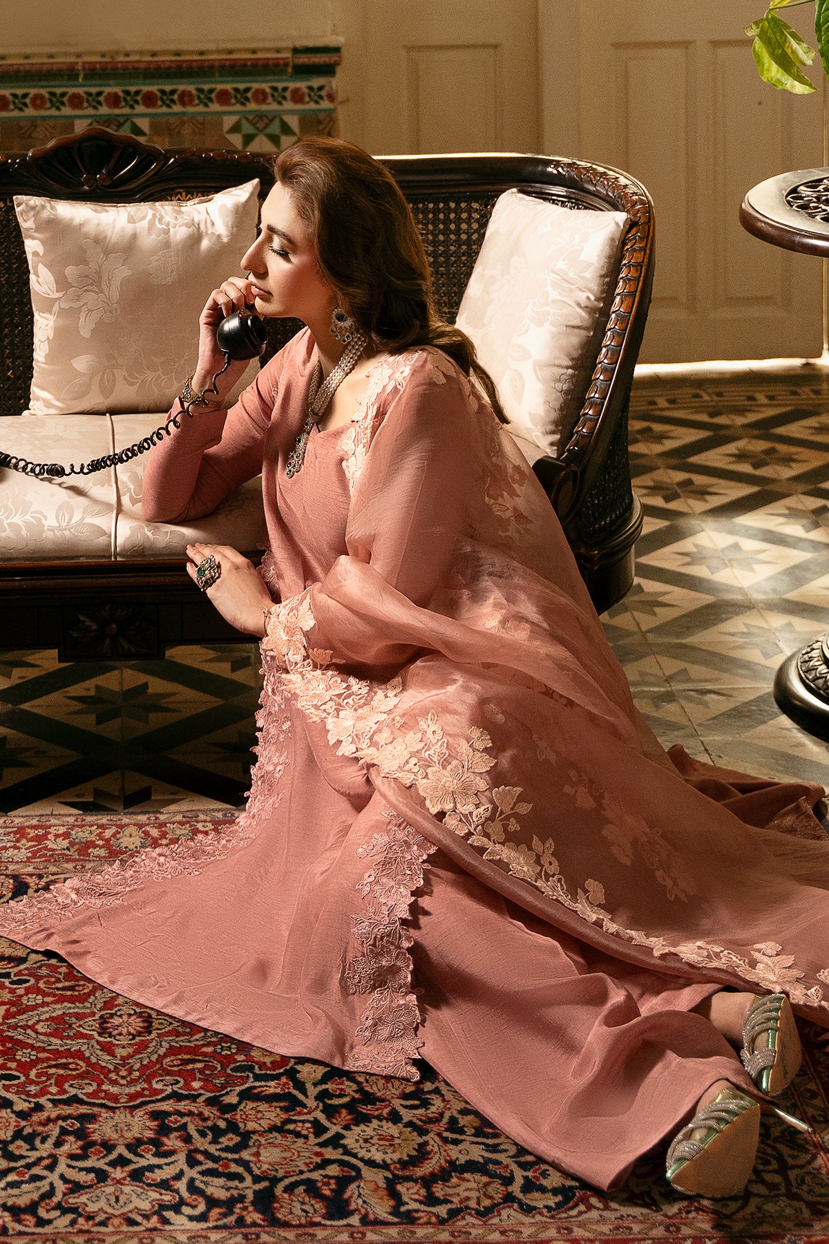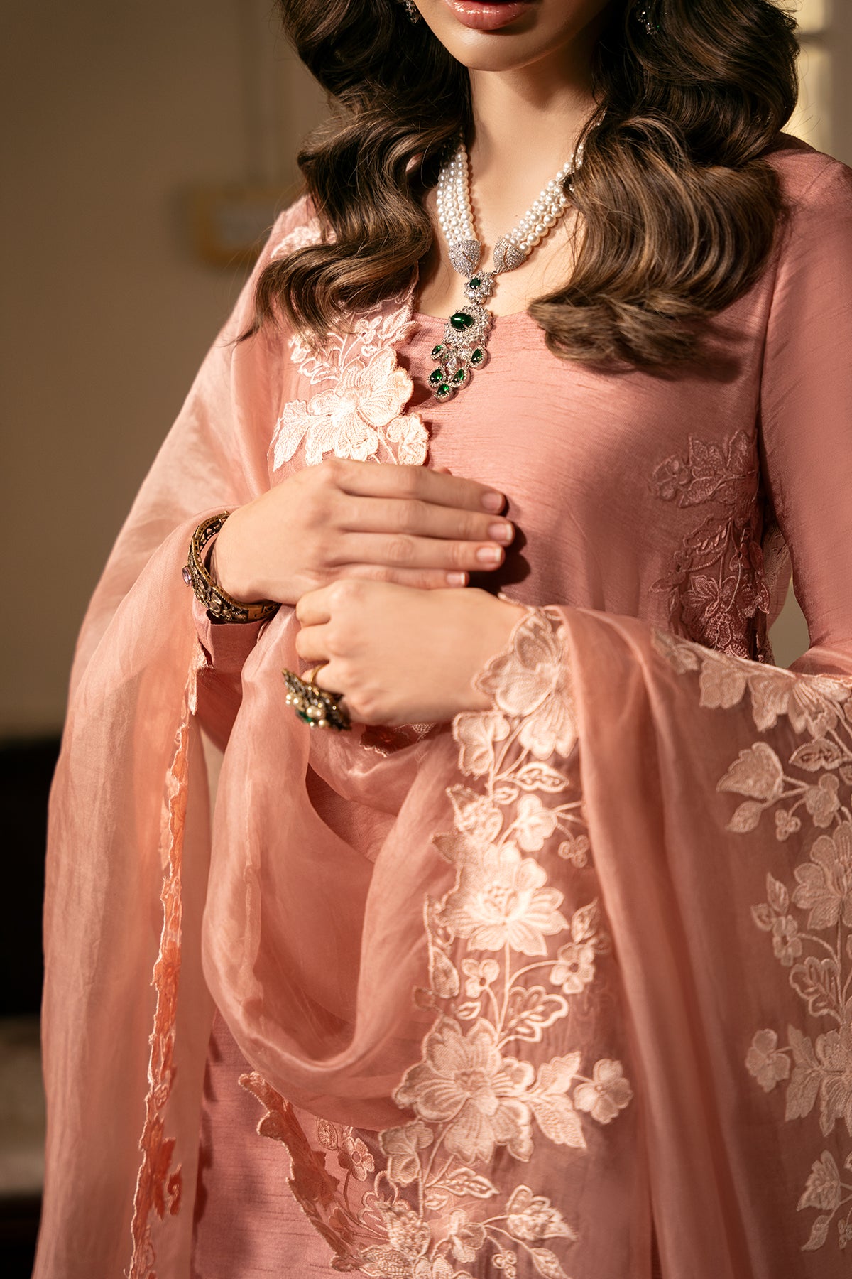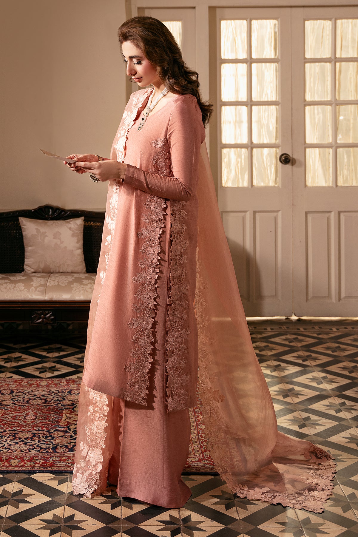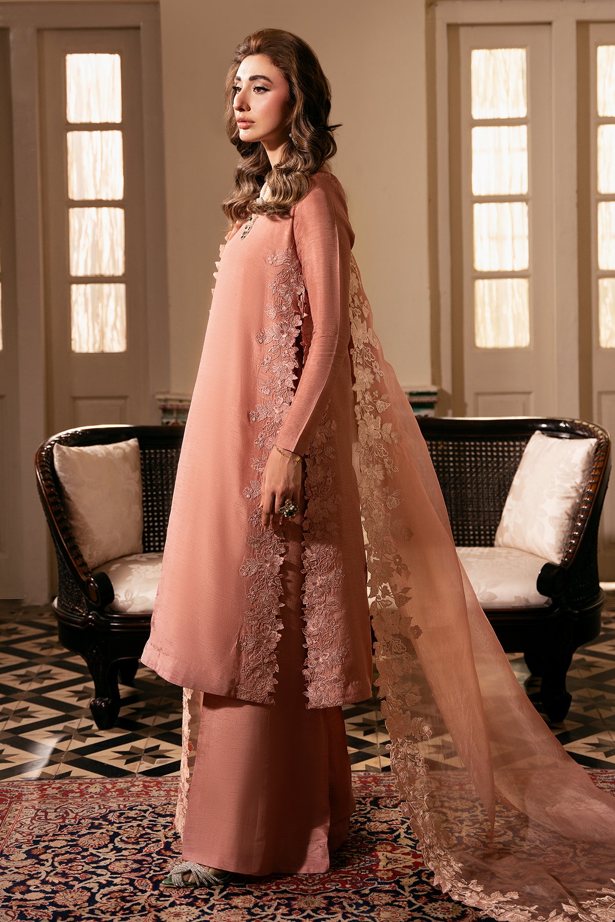 The fresh blush tone is versatile — easy to dress up or down — while a premium organza dupatta with statement threadwork on all four sides adds a soft, graceful finish. A beautifully simple ensemble designed to remain timeless.