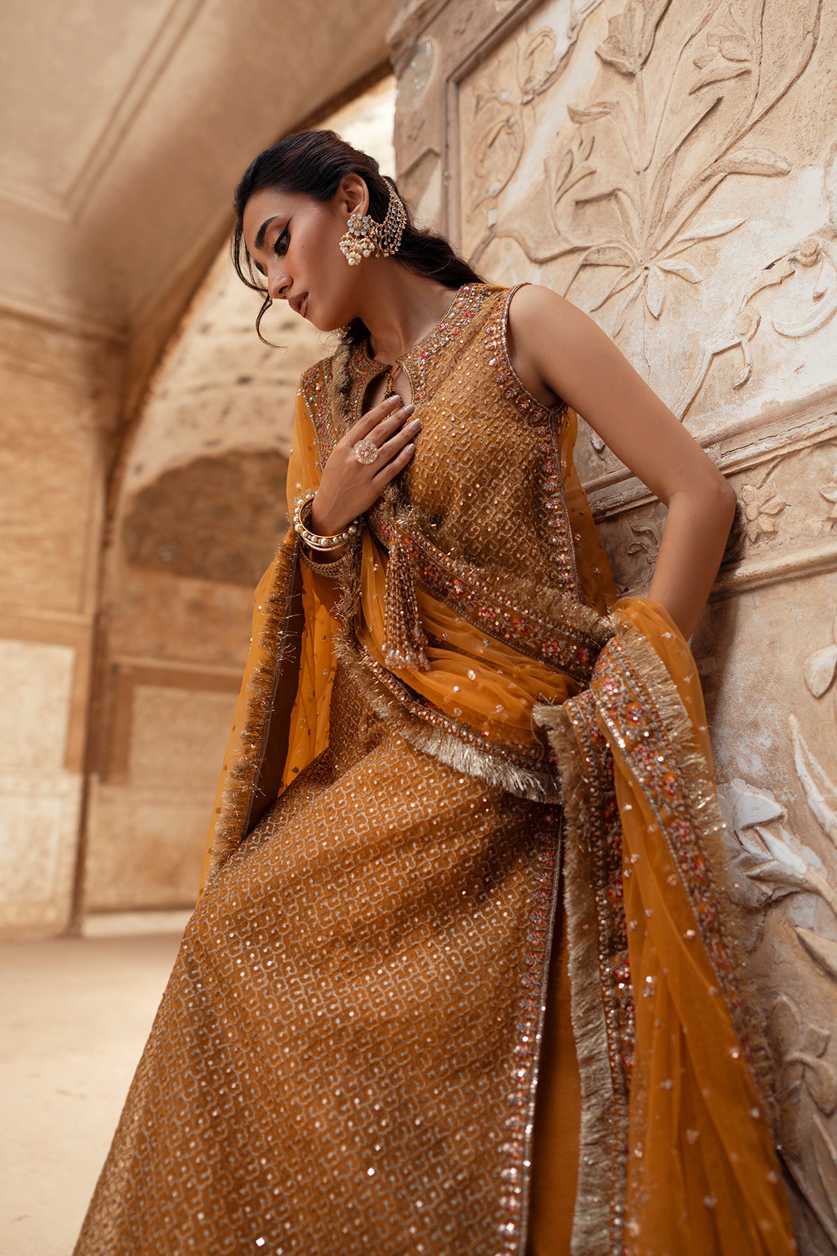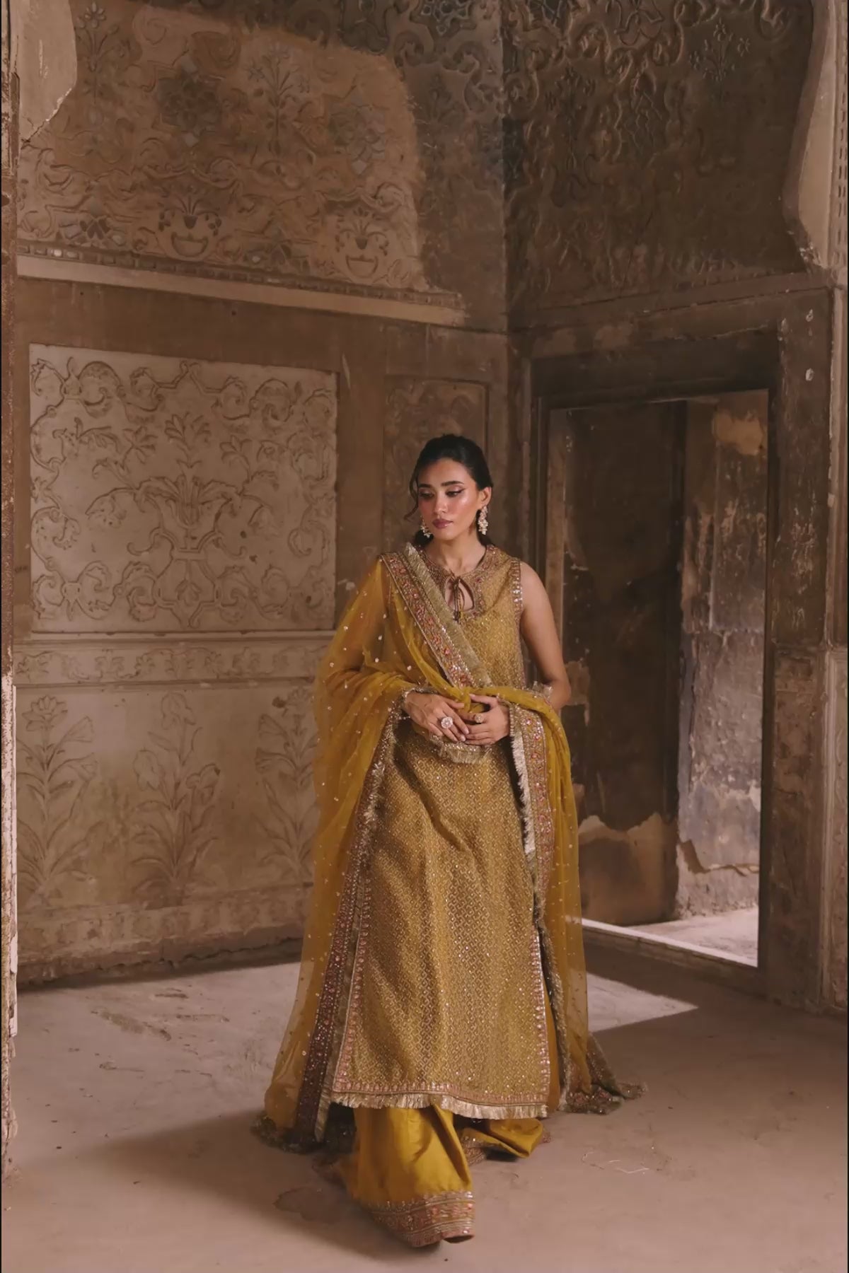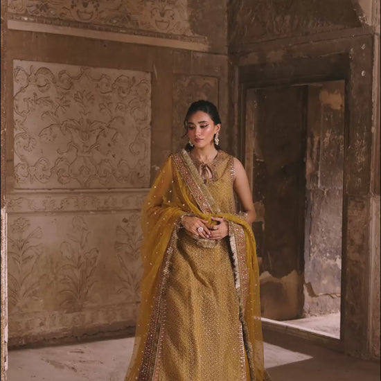 This beautiful gold-yellow long shirt and sharara is fully embellished with contrasting detailing on the slits, neckline, sharara, and paired with a richly embellished dupatta. A perfect pick for a vibrant mehendi event, bringing the right mix of tradition and sparkle. ✨