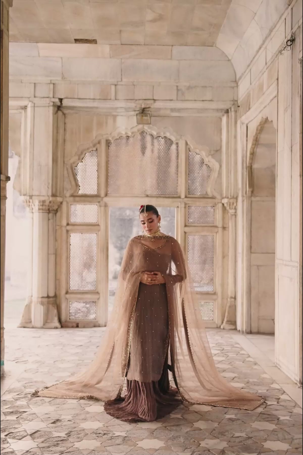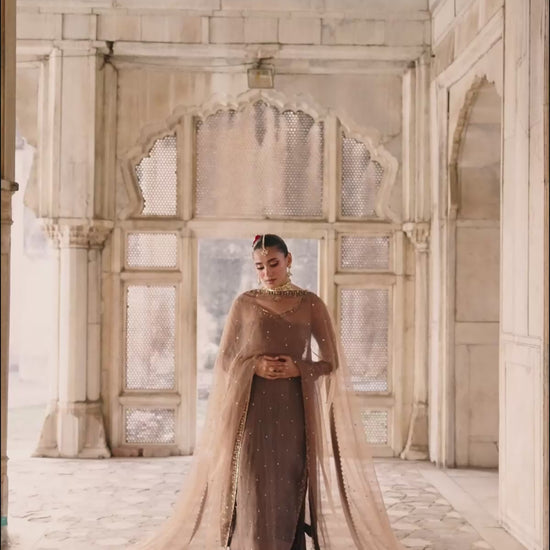 This rich mocha brown long organza shirt is paired with a crushed silk lehenga and a heavily embellished dupatta. Finished with intricate handwork on the front, back, sleeves, and slits — every angle tells a story of craftsmanship.