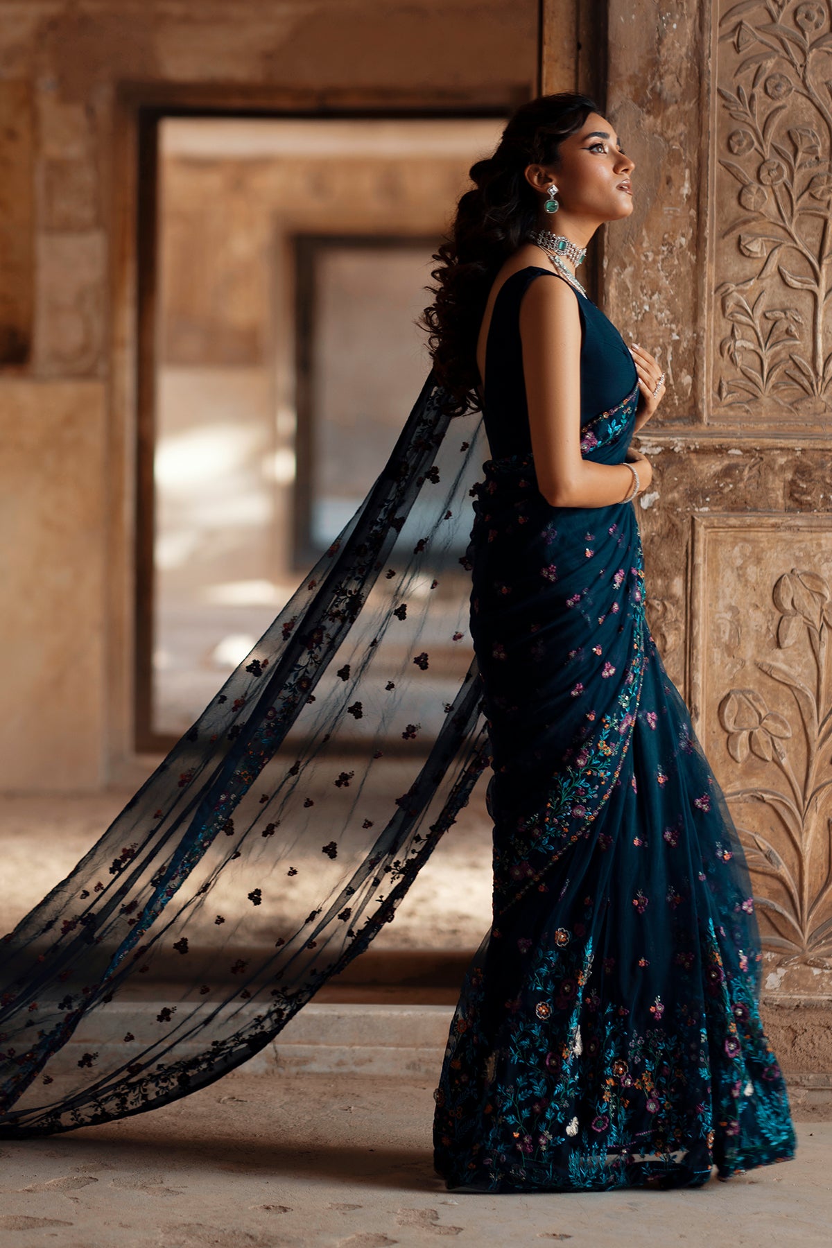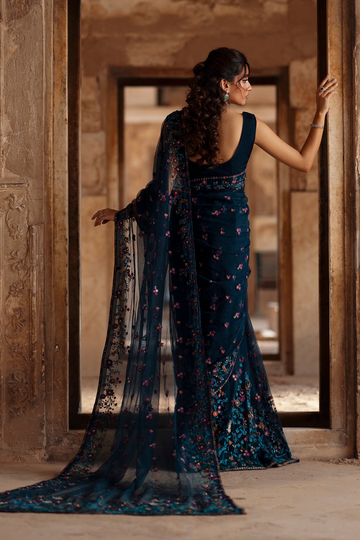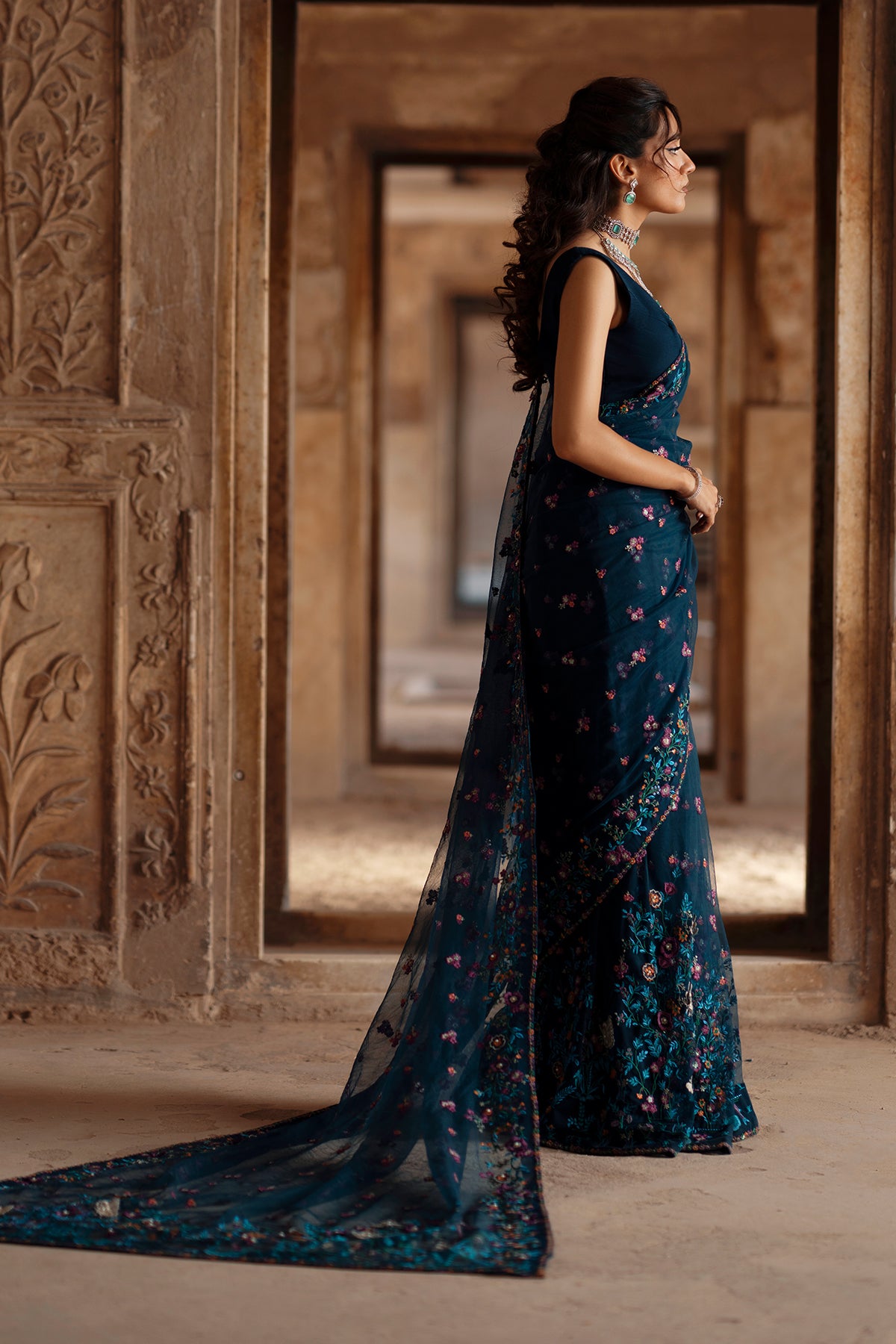 A mesmerizing ink-blue saree that flows like poetry in motion. Designed with a silk petticoat and blouse, the drape is adorned with delicate hand embroidery of florals and vines, blooming across the fabric like a starry garden at night. The sheer trailing pallu adds drama, while the richness of the hue makes it a timeless statement. ✨