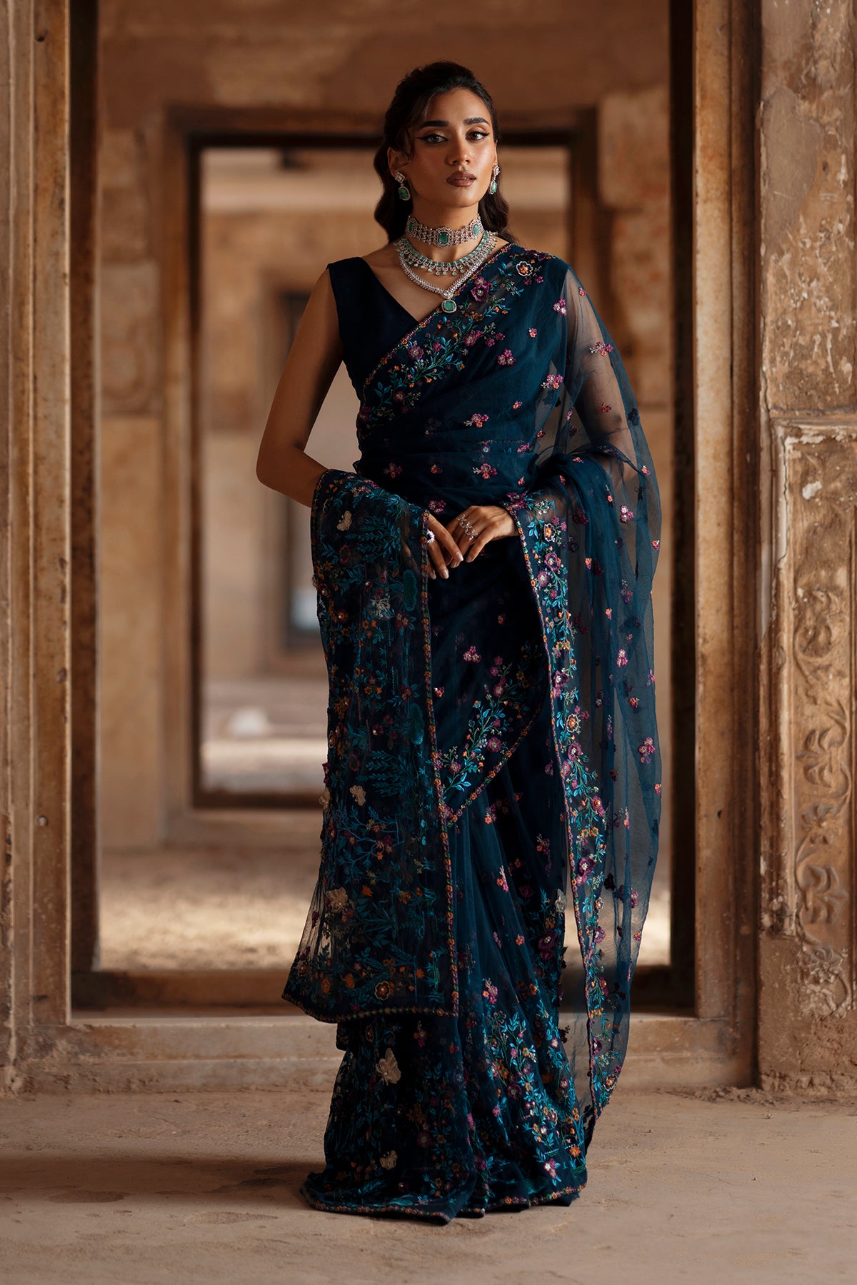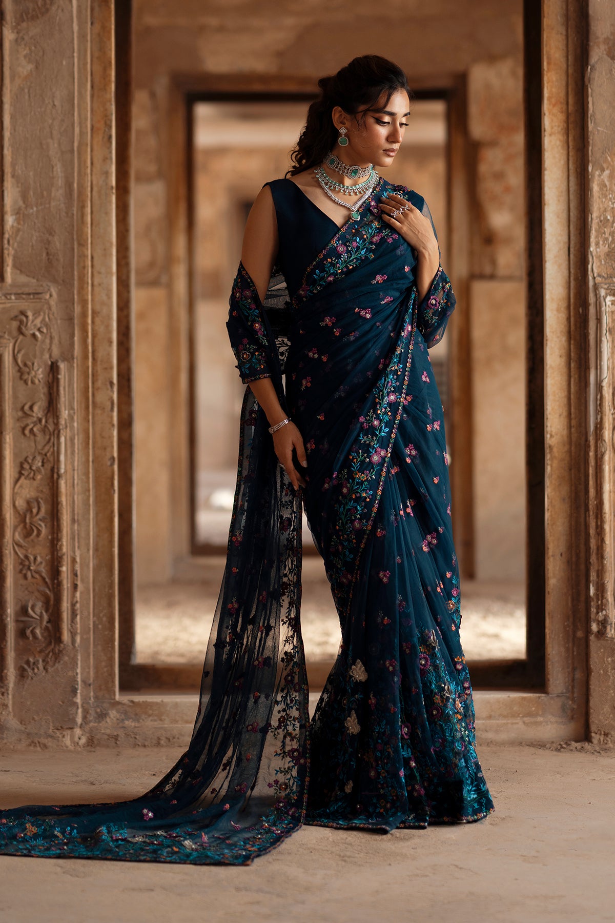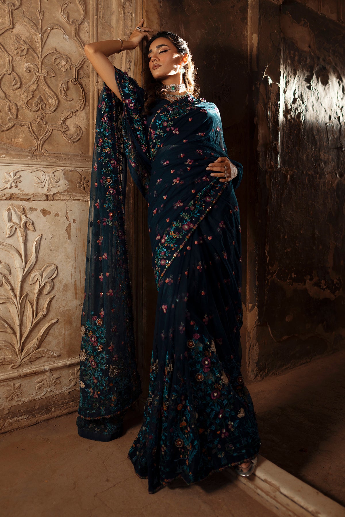 A mesmerizing ink-blue saree that flows like poetry in motion. Designed with a silk petticoat and blouse, the drape is adorned with delicate hand embroidery of florals and vines, blooming across the fabric like a starry garden at night. The sheer trailing pallu adds drama, while the richness of the hue makes it a timeless statement. ✨