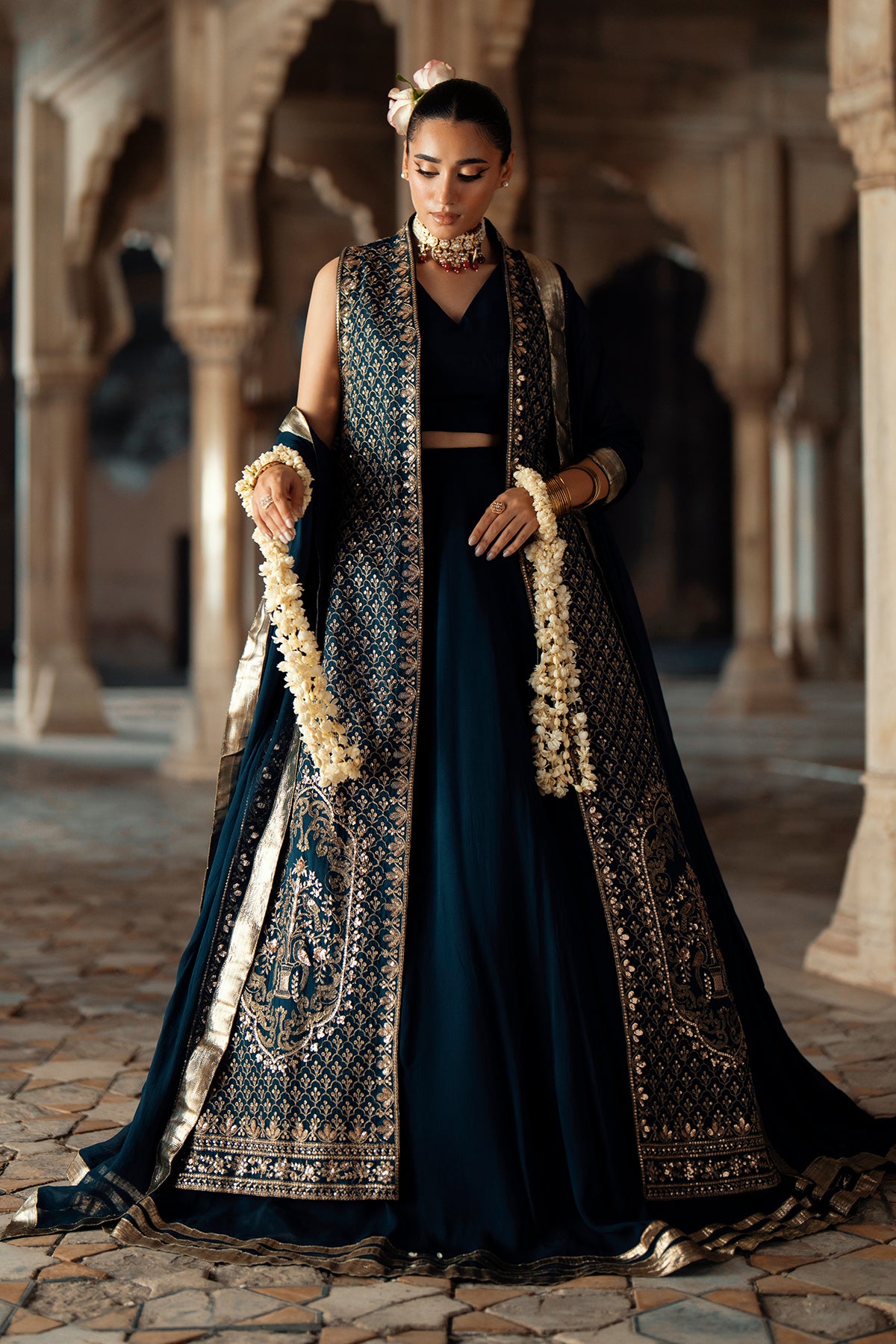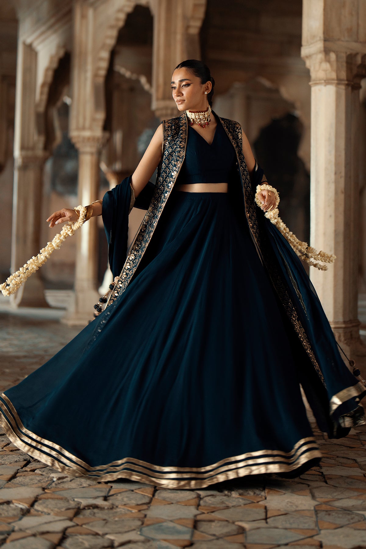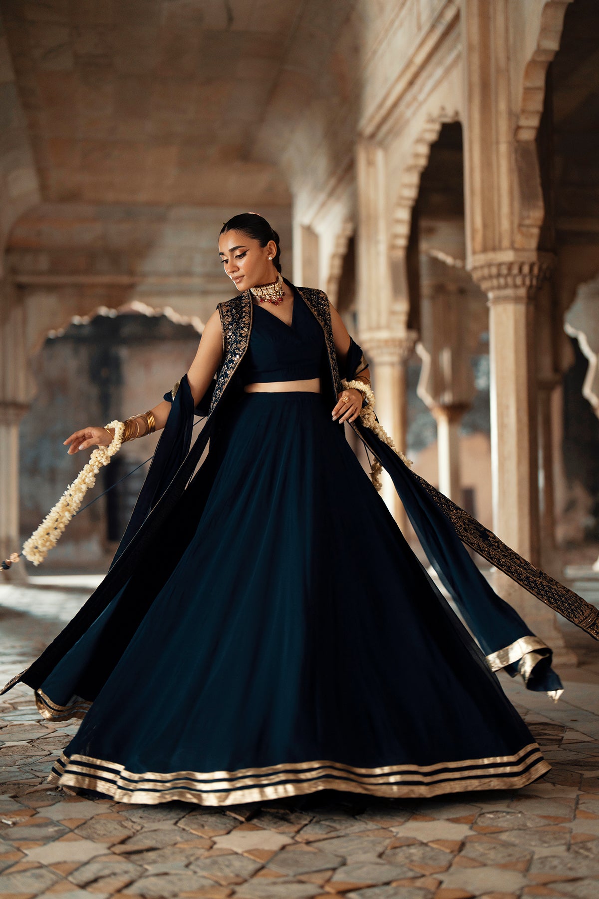 A stunning four-piece dark ink blue silk lehenga choli, paired with a chiffon dupatta and a heavily embellished gown. The lehenga and dupatta are adorned with intricate gotta work, while the gown is fully embellished for that regal finish. ✨