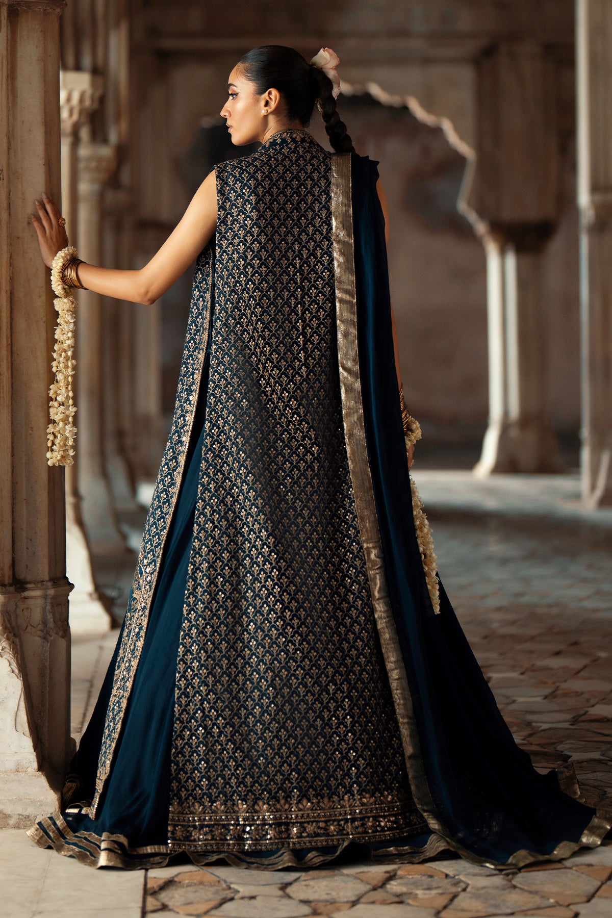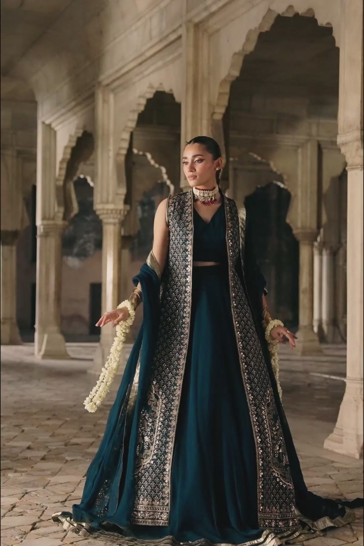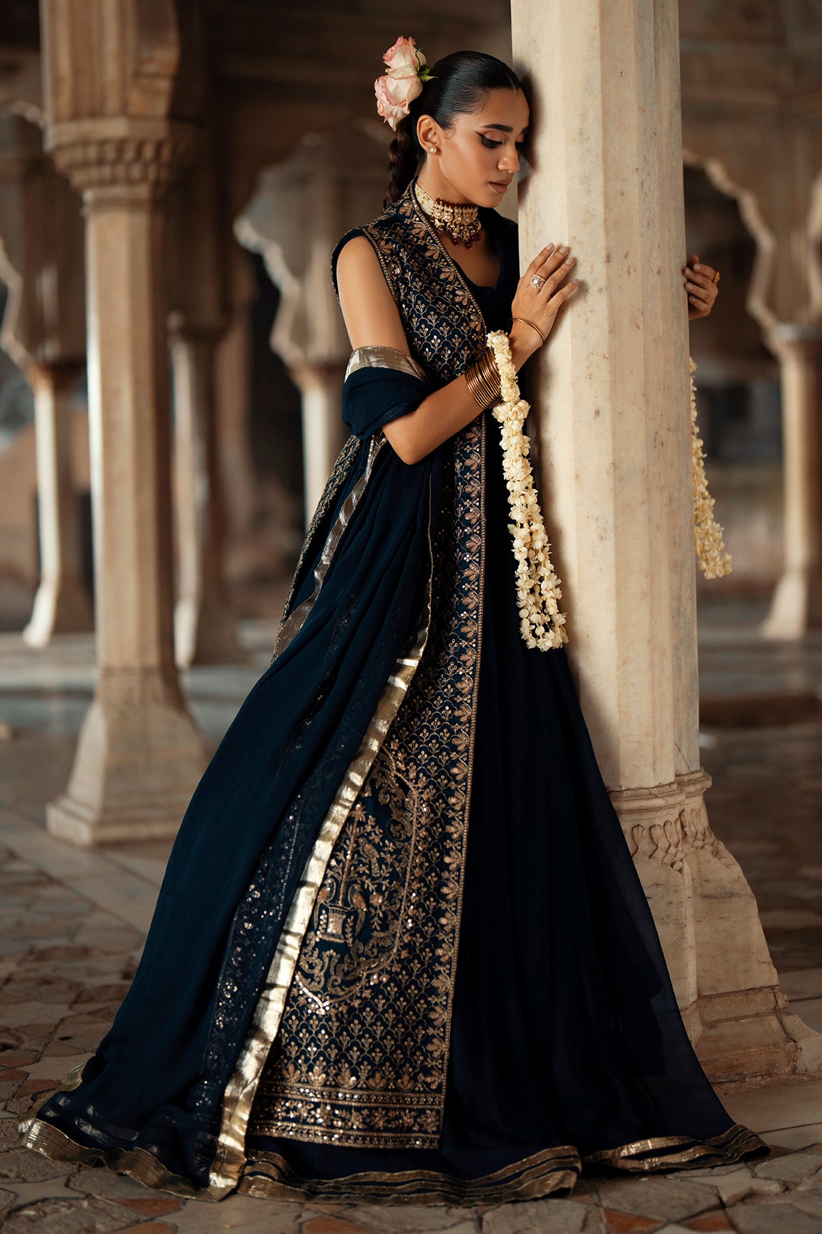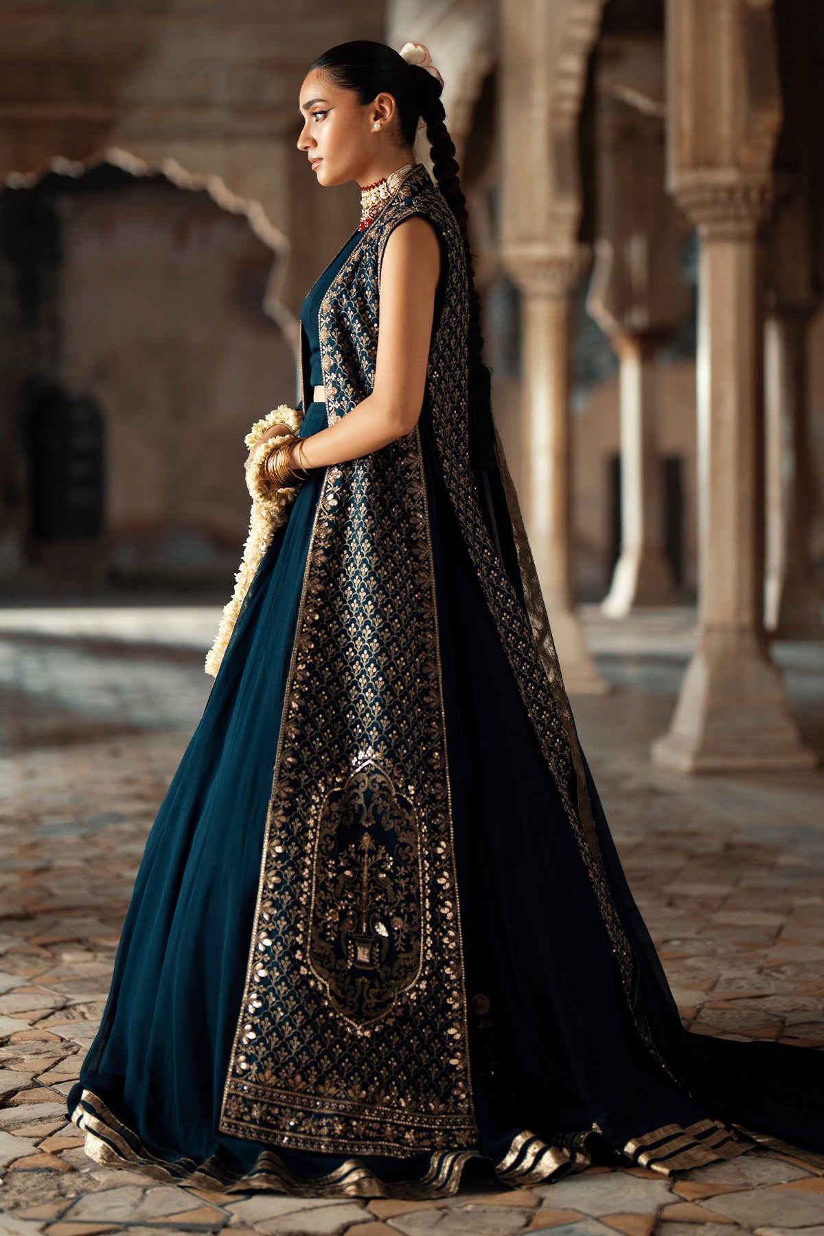 A stunning four-piece dark ink blue silk lehenga choli, paired with a chiffon dupatta and a heavily embellished gown. The lehenga and dupatta are adorned with intricate gotta work, while the gown is fully embellished for that regal finish. ✨