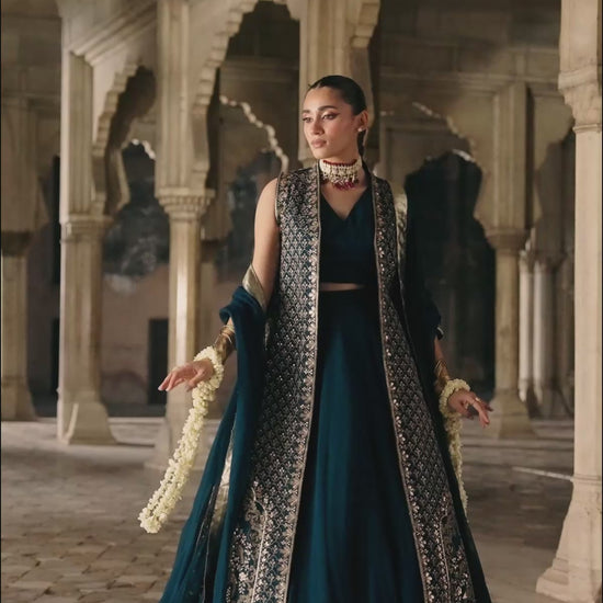 This versatile ensemble can be styled in multiple ways — wear it traditionally as a lehenga choli, or pair the gown with long straight pants for a chic, modern look.
