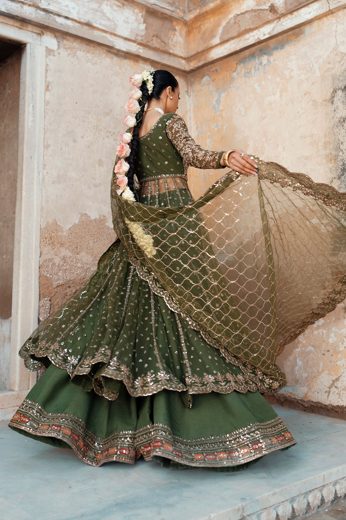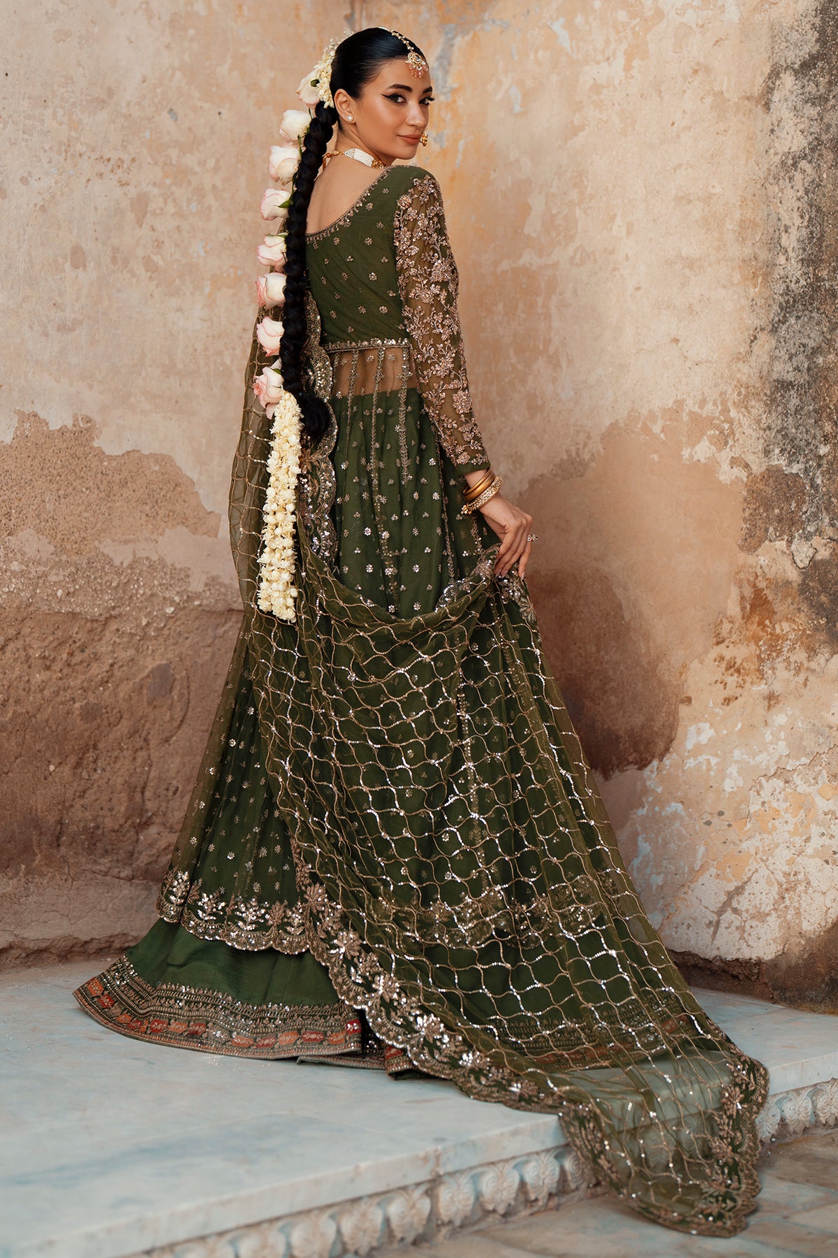 A gorgeous olive-green net peeshwaaz with an embellished net dupatta and a graceful silk sharara — beautifully detailed to make you a true head-turner. Perfect for a mehendi or any festive occasion, this versatile hue is a win for every celebration! ✨🌸