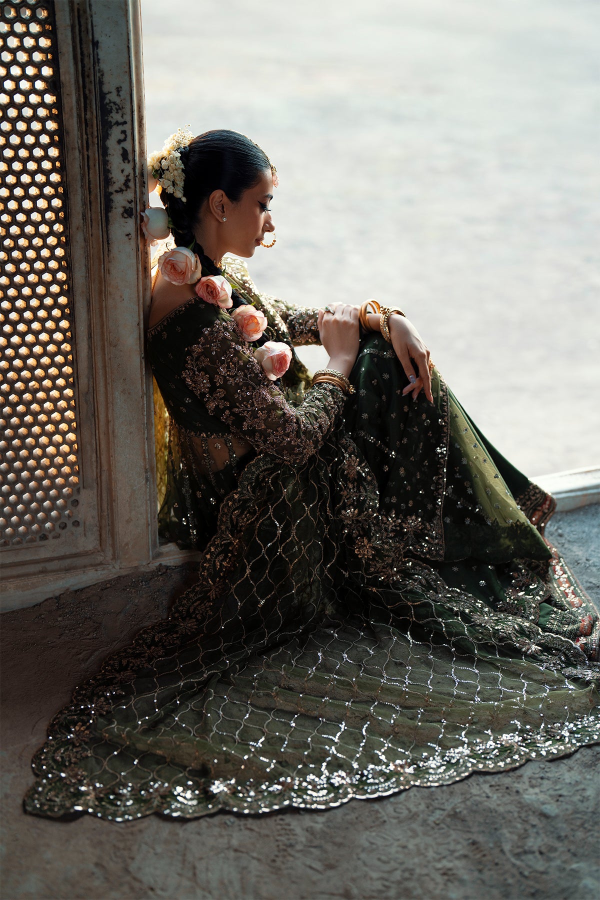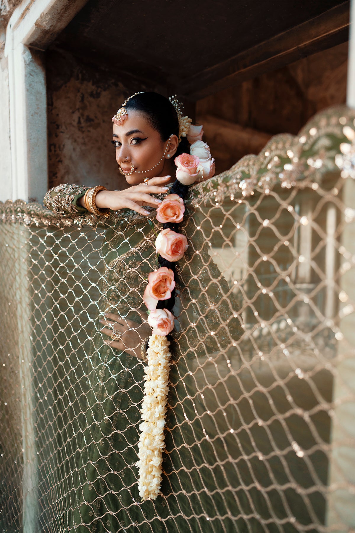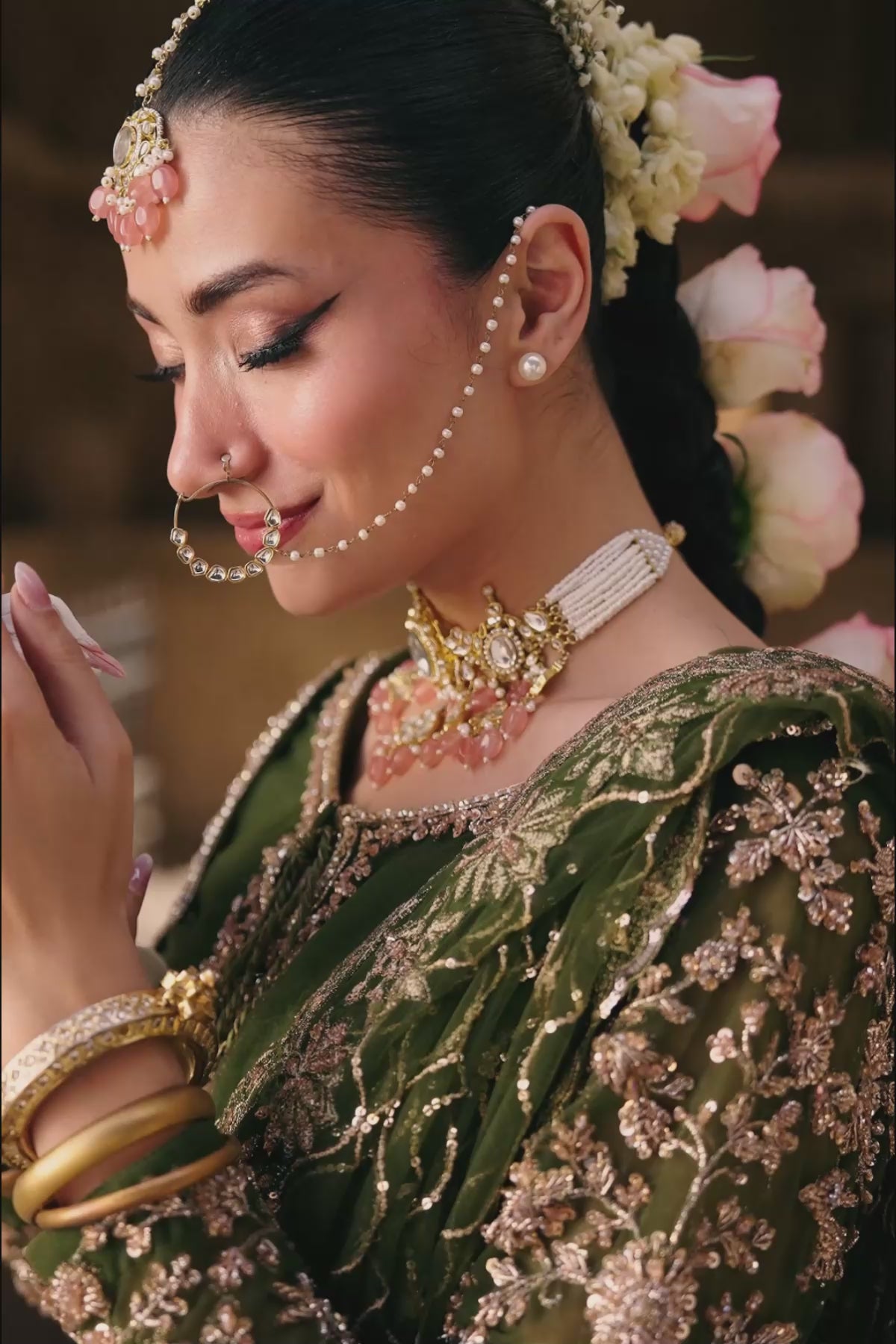 Pair it with fresh pink roses and jasmine in your hair, glowing cheeks, and statement jhumkas — the ultimate dreamy vibe.